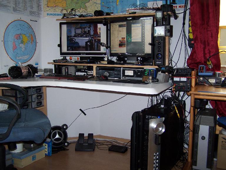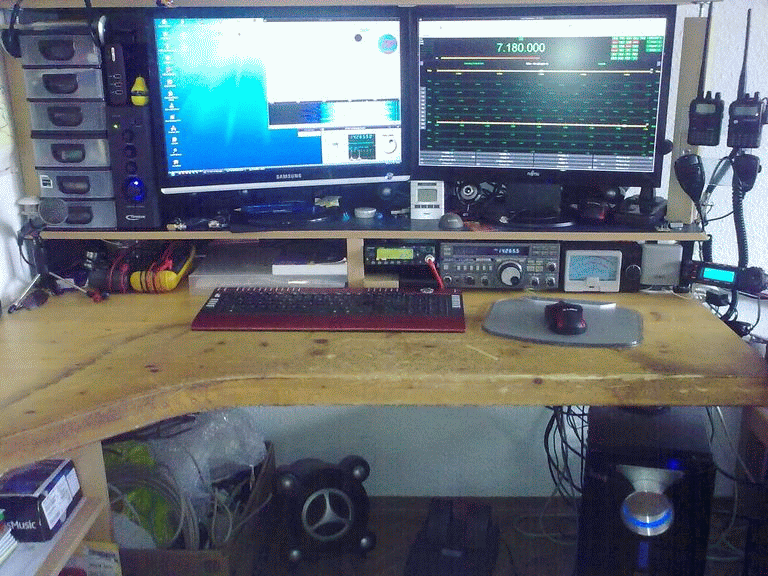 Dual Monitor (jeweils 22”) DualCore Athlon X2 64 (jeweils 2,2 GHz) System / 250 GB + 400 GB HDD / 2048 MB DDR-Ram / Grafikkarte Geforce 8800 GTS 640 / digitale PCI-E 2x Creative Soundkarte X-Fi Extreme Audio Jeweils von Links nach Rechts: oben: Yaesu VX-5 und Kenwood TH-F7E (Gerät repariert, restauriert und überarbeitet) unten: Alinco DR-610T / Yaesu FT-757GX MKI / homemade FT-Meter 10x5 cm Skala / Yaesu FT-857 (Absetzbetrieb) |